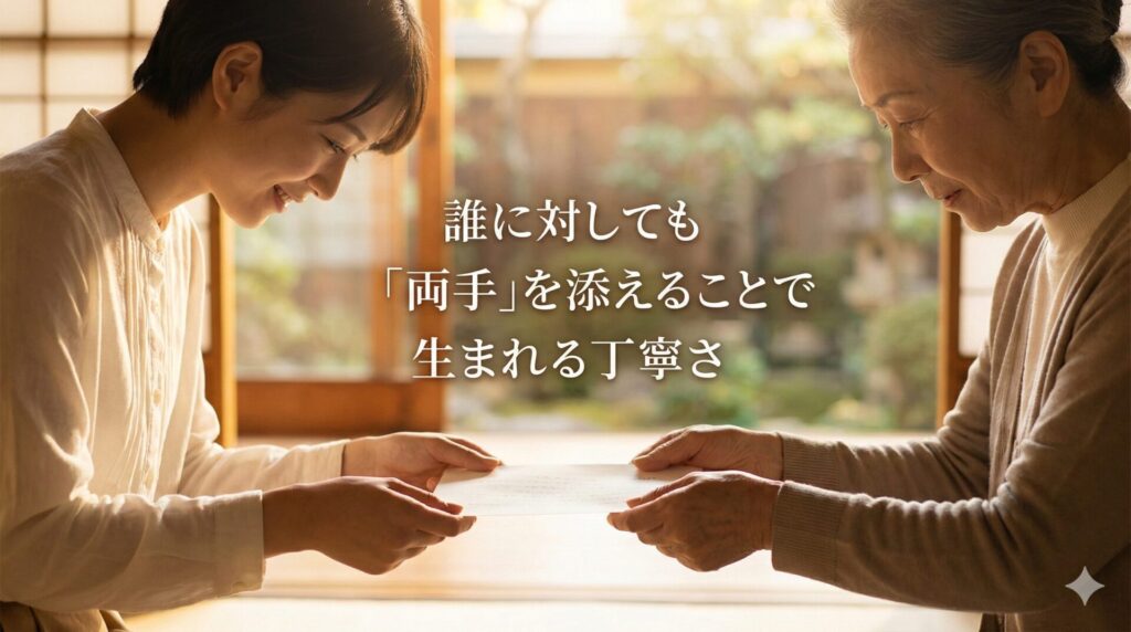 - 誰に対しても「両手」を添えることで生まれる丁寧さ