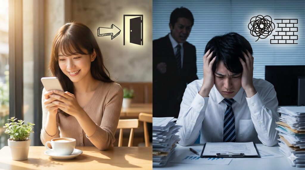 しかし、ここで「プロスペクト理論(損をしたくない心理)」だけで判断するのは危険です。もし自力で辞めようとして引き止めに遭い、さらに数ヶ月も嫌な仕事を続けることになったらどうでしょう?