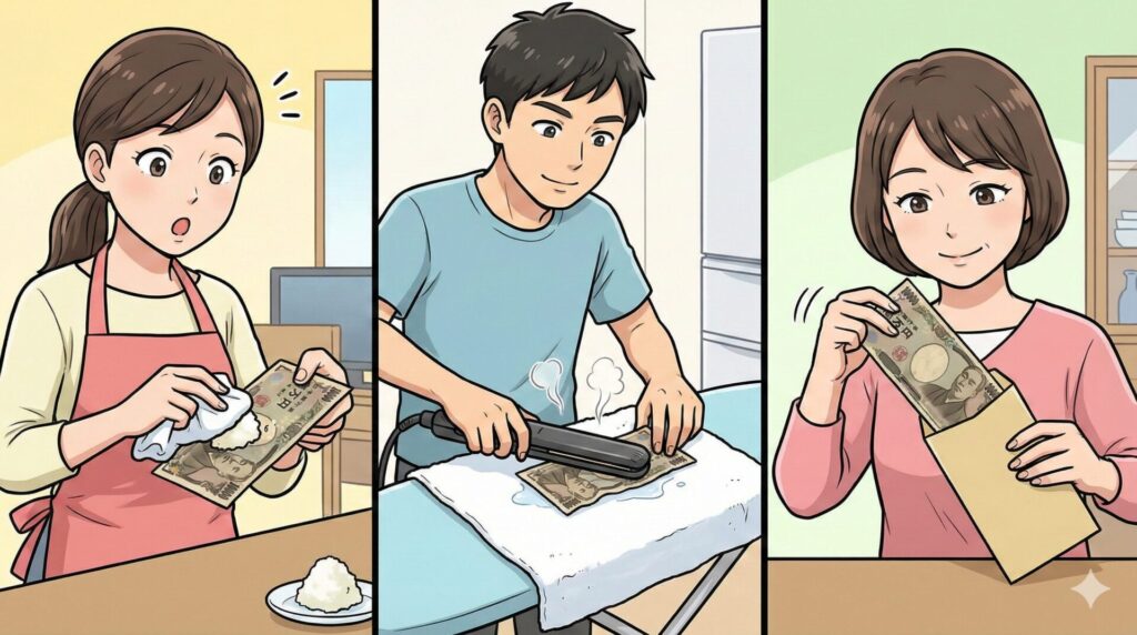 低温(100度〜120度くらい)設定にして、サッと通すだけで細かいシワが伸びます。ただし、ホログラム部分は熱に弱いので絶対に避けてくださいね。お札が溶けたら、それこそ目も当てられません。
