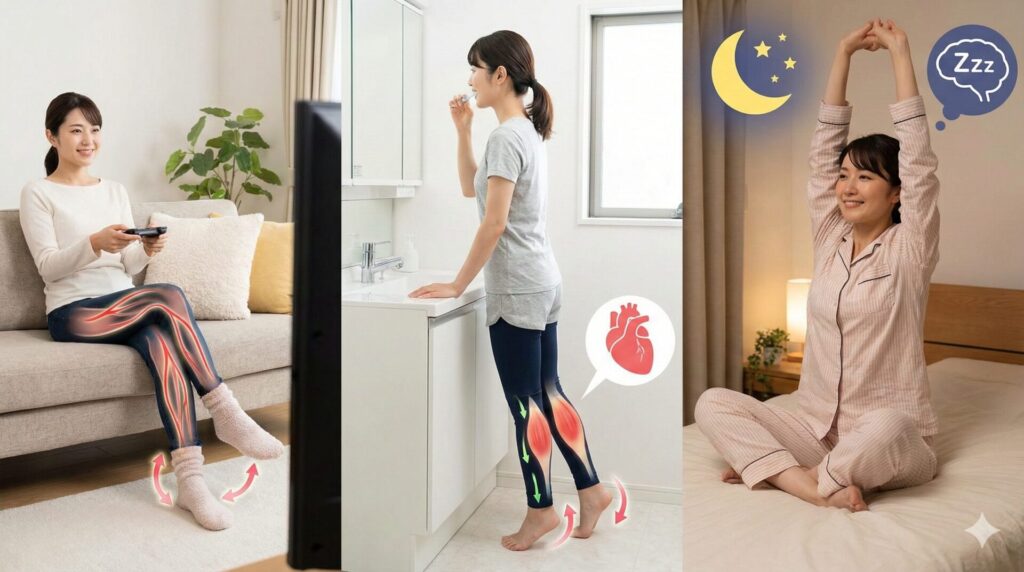 • テレビを見ながらの足首運動や、歯磨き中のかかと上げを取り入れる