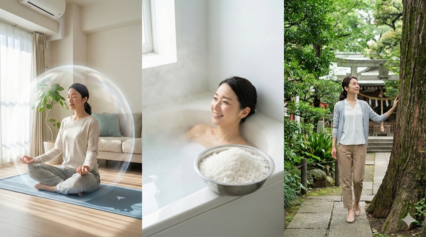 帰宅したら、まずはその日に浴びた「邪気」を洗い流すことが最優先です。 一番のおすすめは、やっぱり「塩風呂」ですね。 スーパーで売っている粗塩で構いません。それをひとつかみ、湯船にドボンと入れて入浴する。これだけで、お湯の浄化力が跳ね上がります。 お酒(日本酒)を少し足すとさらに強力です。 お風呂に入りながら、「今日自分にくっついてきた重いもの、全部お湯に溶けて流れていけー」とイメージしてください。 シャワーだけで済ませてしまう日もあるかと思いますが、特に「今日はキツかったな」という日こそ、5分でもいいから湯船に浸かってみてください。 お湯を抜くとき、渦を巻いて流れていくお湯と一緒に、その日の疲れも全部排水溝へ吸い込まれていくのを見届けるのも、一種の儀式としておすすめですよ。