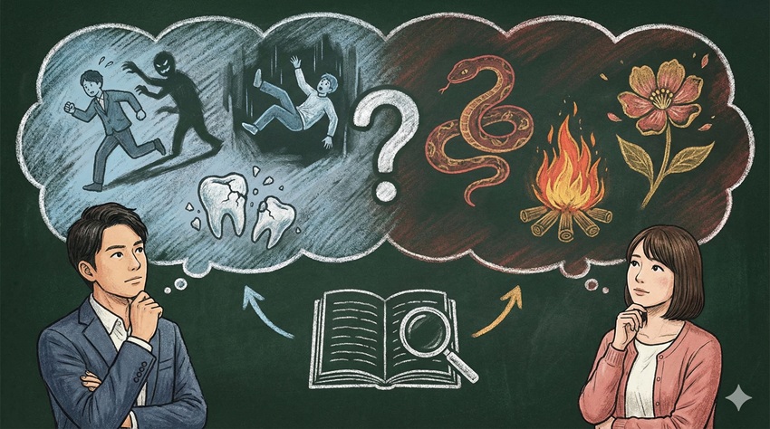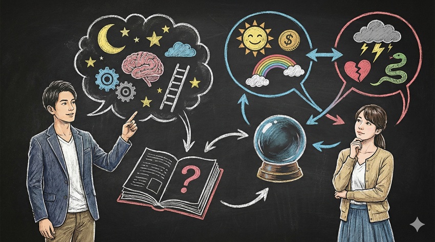 ……あ、いや、待てよ。こっちの視点もありますね。同じシンボルでも、その時のあなたの「感情」によって解釈は真逆になることもあるんです。大切なのは、本に書いてある定型文だけを信じるのではなく、その夢の中であなたがどう感じたか、という「主観」です。