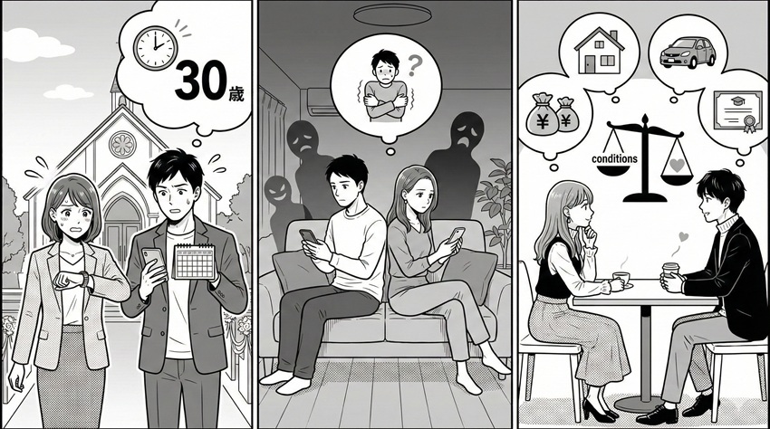 - 妥協の裏には結婚への焦りや年齢のリミットといった社会的圧力が潜んでいる