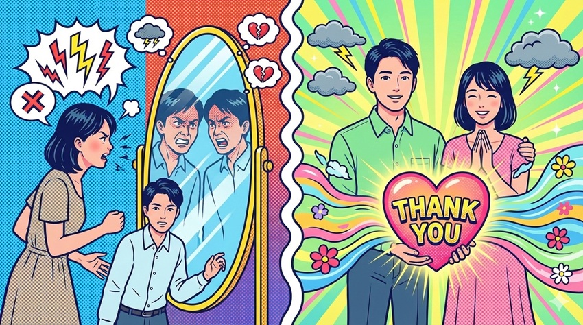 心理学では「返報性の法則」がありますが、これをスピリチュアルに応用しましょう。あえてこの状況に対して「気づきをくれてありがとう」と心の中で唱えてみるのです。怒りの最中に感謝なんて無理……と思うかもしれませんが、これは「感情」ではなく「技術」として行ってください。言葉が持つ「言霊」の力を借りて、場の波動を強制的に書き換えるのです。