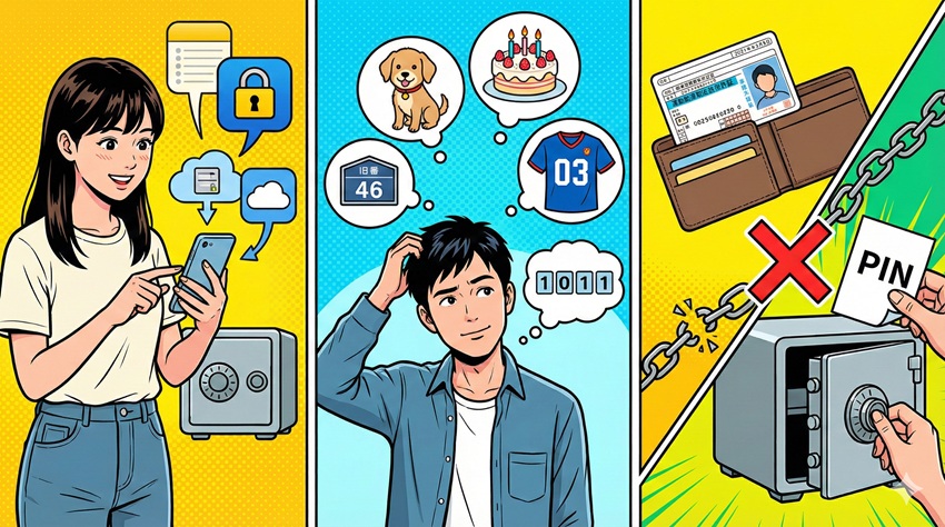 「1111」や「1234」、あるいは自分の誕生日は、推測されやすいため推奨されません。
