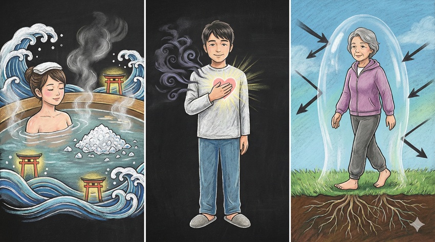 おすすめは、天然塩をたっぷり入れた「塩風呂」に浸かること。塩は古来より負のエネルギーを吸着し、無害化する性質があると言われています。お風呂上がりに、左肩を意識しながらシャワーの冷水と温水を交互にかけるだけでも、毛細血管が刺激され、停滞していたエネルギーの「しこり」が解けていきます。これは心理学でいう「プライミング効果(清められたという暗示)」も相まって、深い安心感をもたらします。