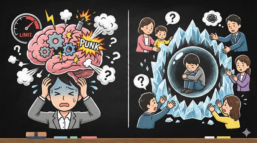 悩みを言語化できないまま感情を溜め込むのは、出口のない圧力鍋の中にいるようなものです。火(ストレス)が燃え続けているのに、蒸気が逃げる場所(言葉)がない。この状態が続くと、心理学でいう「燃え尽き症候群」や、深刻な身体症状として現れることがあります。