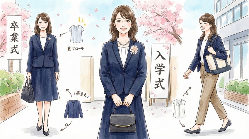 卒業式にはダークトーンの小物で落ち着かせ、入学式にはベージュのジャケットを羽織ったり、明るいインナーに変えたりするだけでOK。