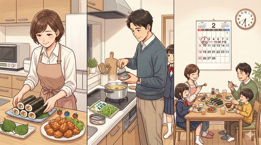 この流れなら、実質的な調理時間は10分程度。残りの時間は、家族で笑い、語り合うために使いましょう。平日の夜だからこそ、こうした「ルーティン化」が心の余裕を生みます。「最終的には『好き』かどうかですよ、その行事を楽しめるかどうかは」。あなたがリラックスしていれば、家族全員にとって最高の節分になります。