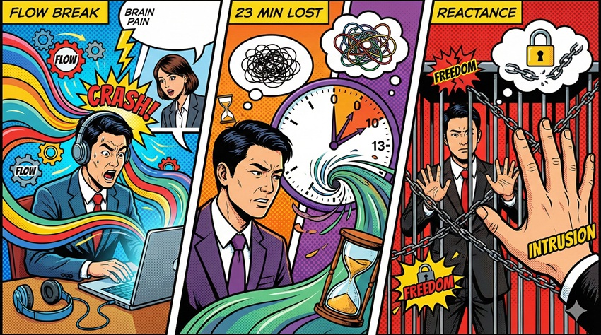 脳はこの「余計なエネルギー消費」を本能的に嫌うため、中断を強いる存在を敵と見なしてしまいます。