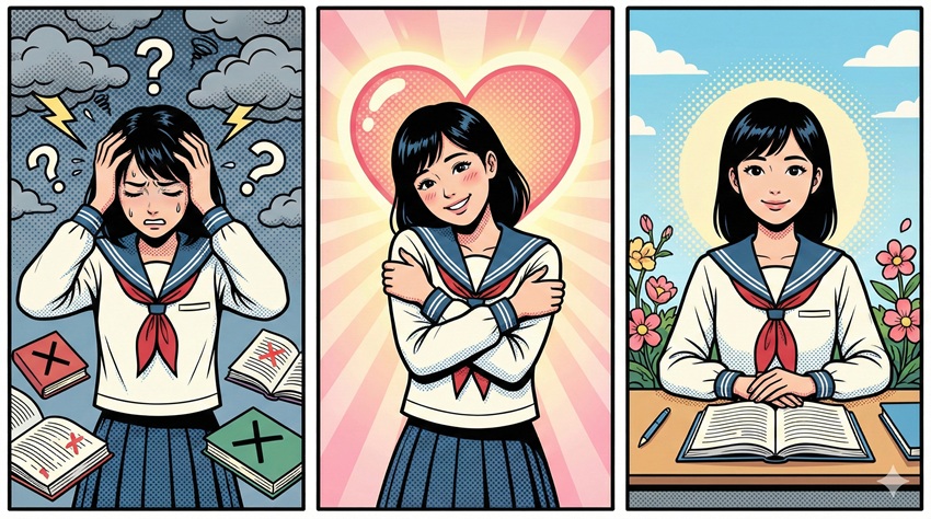 「勉強ができない自分」を責める代わりに、「今、私は悩みを抱えて辛い状況にいる。集中できないのも無理はない。そんな中で、机に向かおうとしている自分は本当によくやっている」と言葉をかけてあげてください。
