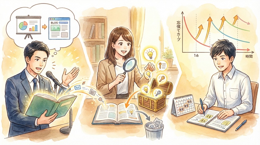 材料を冷蔵庫に入れたまま(インプットのみ)にしておけば腐って忘れてしまいますが、一度料理(アウトプット)してしまえば、それはあなたのレパートリーとして定着します。