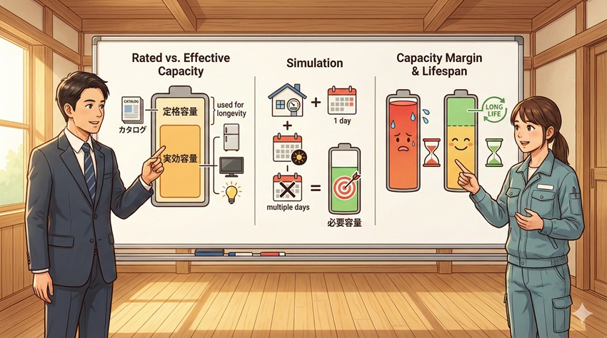 - カタログの定格容量ではなく実際に使える実効容量を基準にする